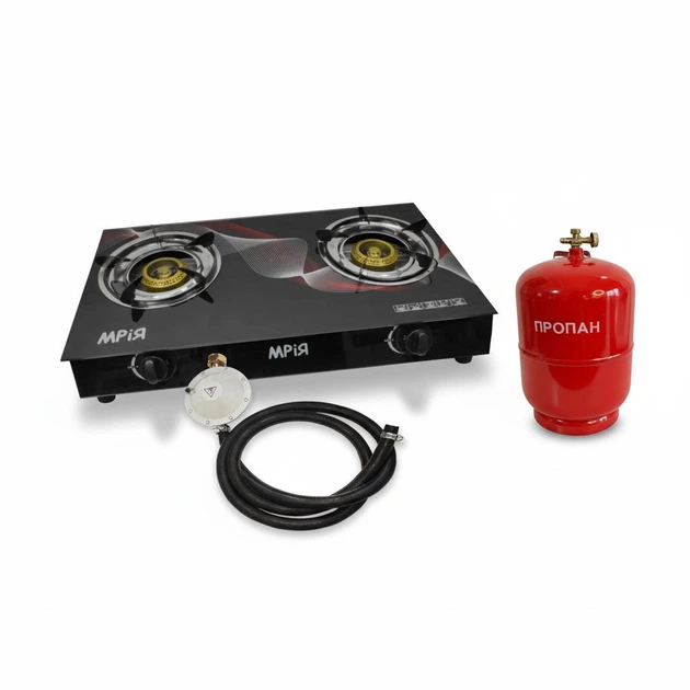 Плита-таганок настільна газова Мрія 2 Скло з балоном 27 л ( підключення 3м шланга, редуктор, хомути)