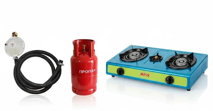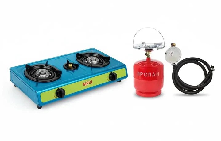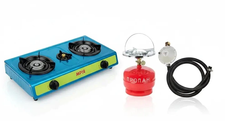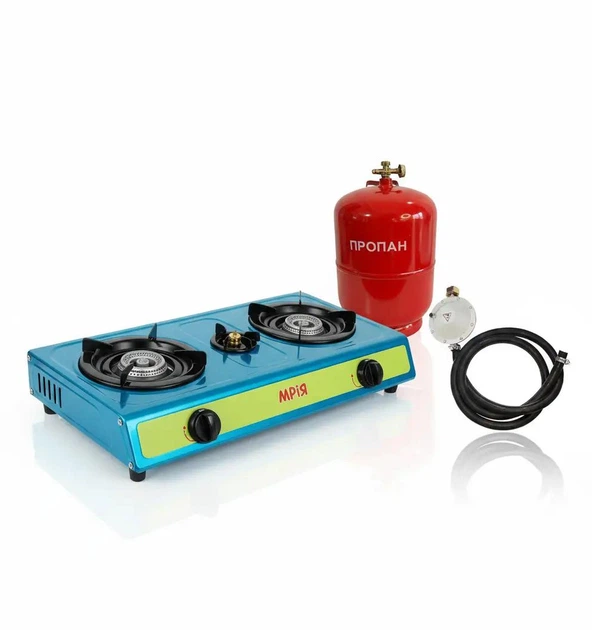 Плита-таганок настільна газова Мрія 3 конфорки нержавіюча сталь з балоном 8 л ( підключення 3м шланга, редуктор, хомути)