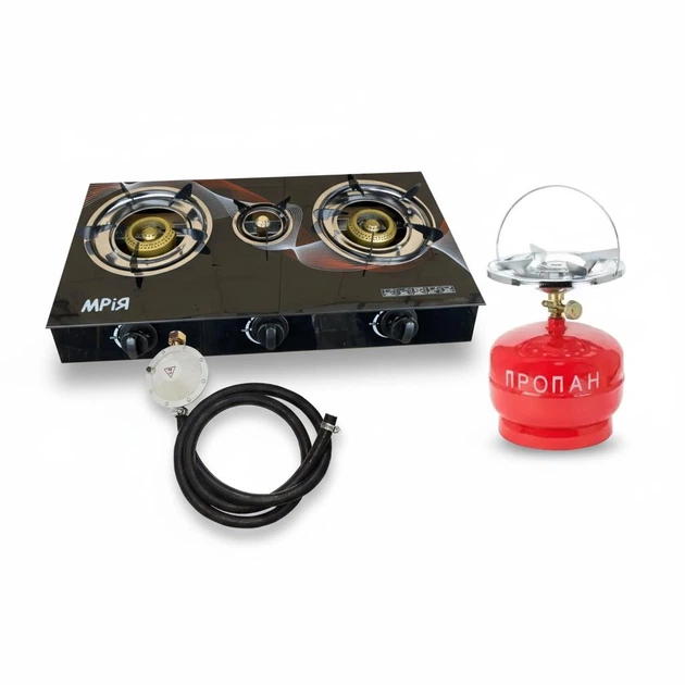 Газова плита-таганок настільна Мрія 3 конфорки Скло з балоном 5 л ( підключення 3м шланга, редуктор, хомути)