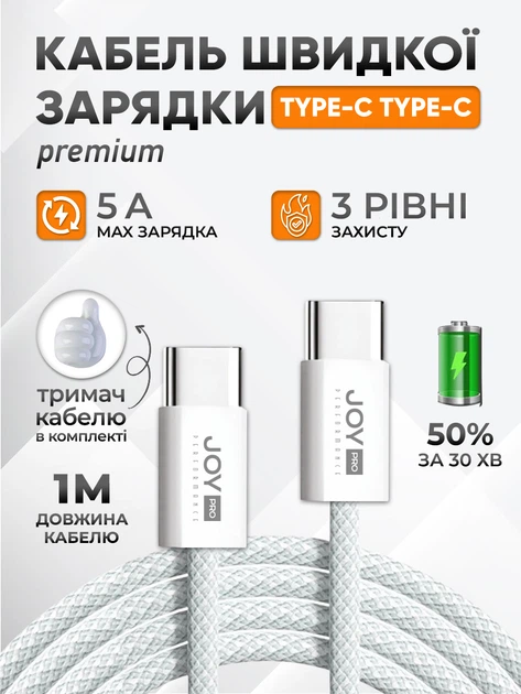 Кабель швидкої зарядки андроід айфон Type-C JoyPro 20W White зарядний шнур USB-C 1 метр 5А для смартфонів Apple iPhone Andro