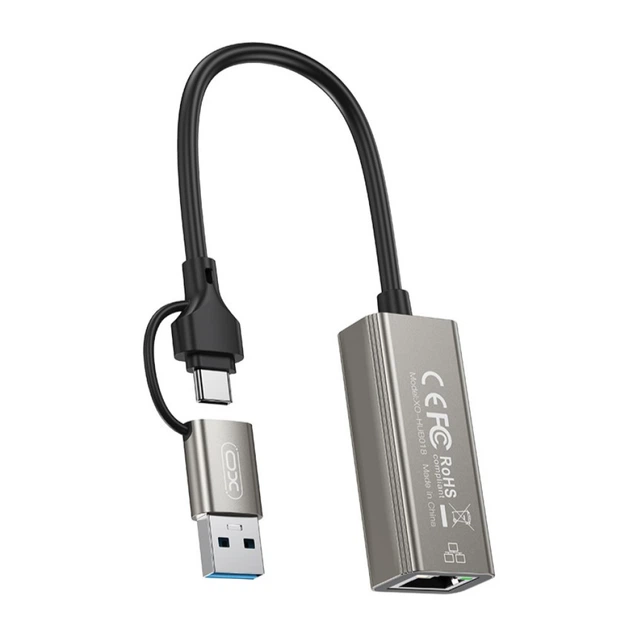 Перехідник адаптер USB-хаб 2в1 XO HUB018 USB + Type-C to RJ45 Сірий 51134