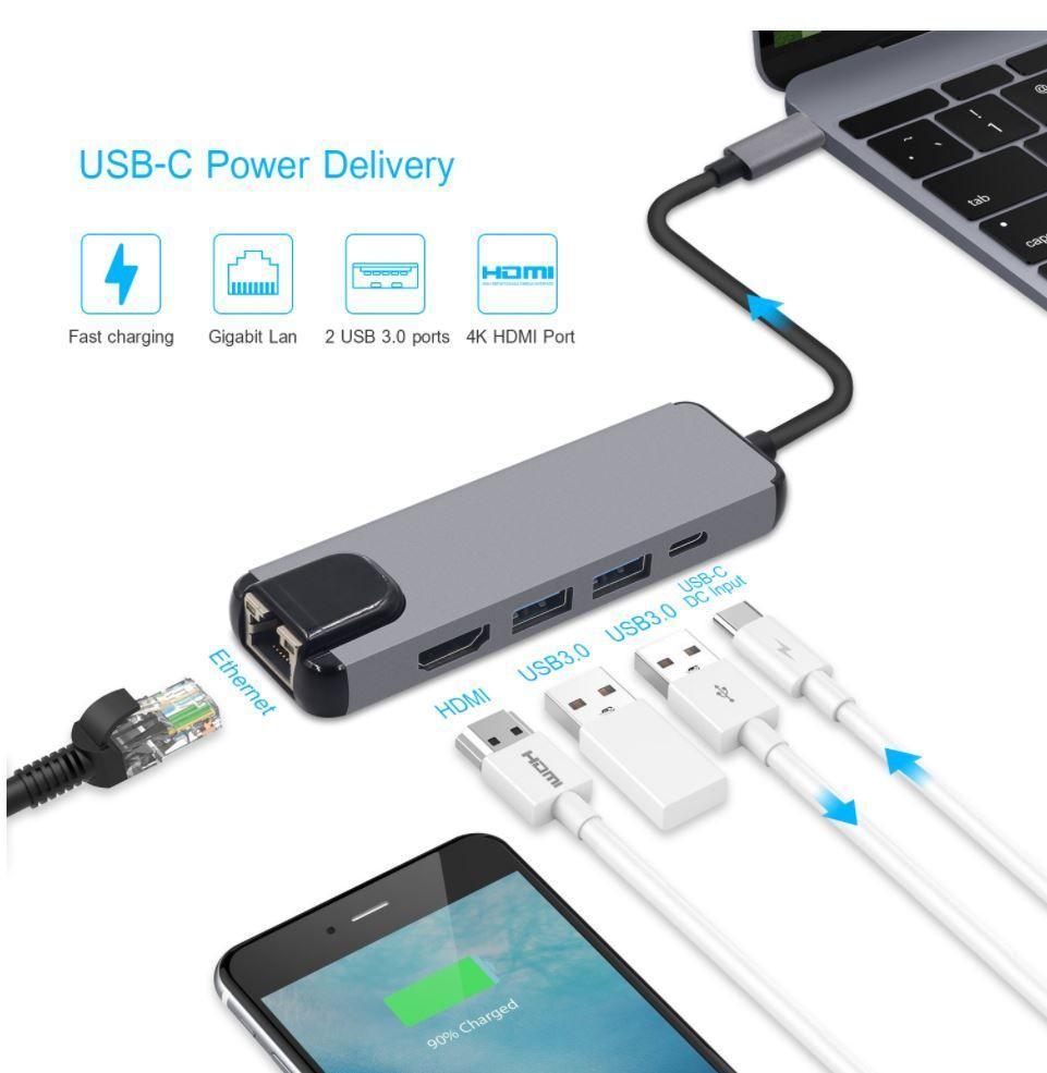 Переходник Type-C to HDMI Lan RJ45 2xUSB3.0 USB-C Переходник / Адаптер / Мультипорт 5в1 USB Type-C 3.1 to HDMI, RJ45 Ethernet LAN, два порта USB 3.0 и USB Type-C мама (для одновременной зарядки), позволяет любому ноутбуку, оснащённому портом USB-C (Thunderbolt 3) (DisplayPort Alt Mode for USB-C) выводить видеосигнал через HDMI источник; устанавливать быстрый и надежный проводной доступ в Интернет для передачи данных со скоростью до 100 Мбит через