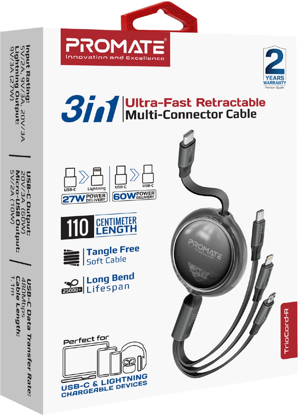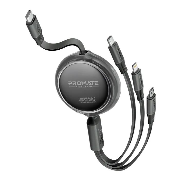 Дата кабель USB-C to Lightning 1.1m 27W + USB-C 60W + Micro USB TrioCord-R black Promate (triocord-r.black) triocord-r.black