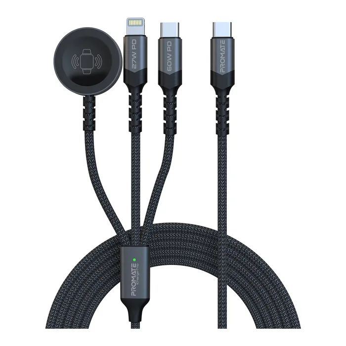 Дата кабель USB-C to Lightning 27W + USB-C 60W + Apple Watch 2.5W 1.5m icharge trio black Promate (icharge-trio.black) ichar