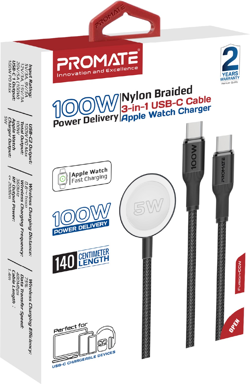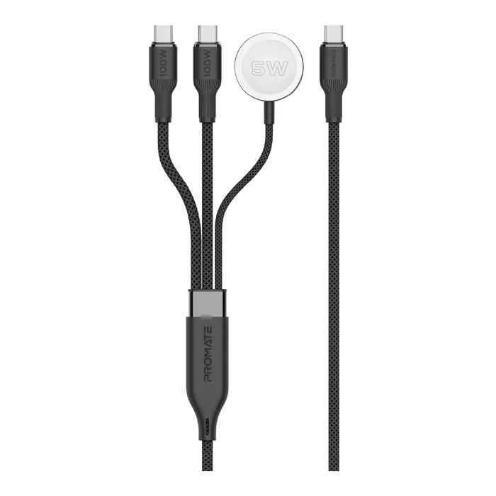 Дата кабель USB-C to 2xUSB-C 100W + Apple Watch 5W 1.4m FUSION-CCW black Promate (fusion-ccw.black) fusion-ccw.black