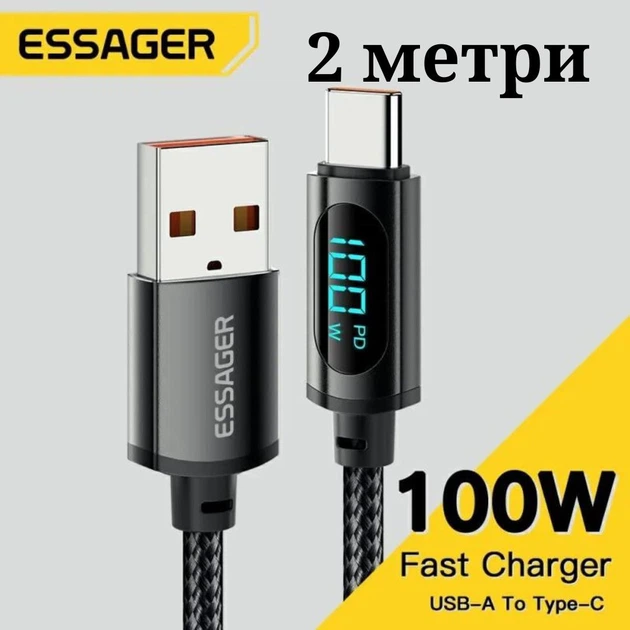 Кабель usb type c для швидкої зарядки ESSAGER 7А 2 метри чорний з ваттметром