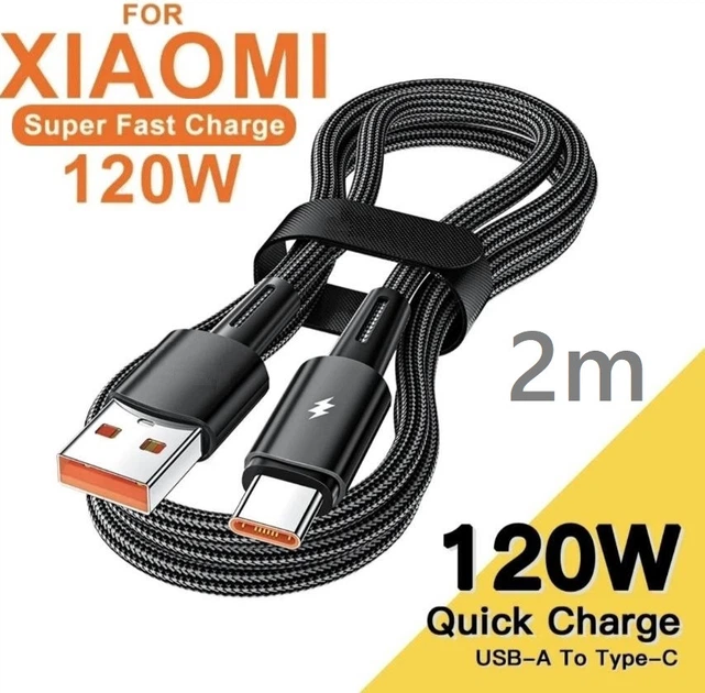 Кабель швидкої зарядки для Xiaomi 120W 90W 67W 33W Mi Turbo Charge USB Type-C 6A 2м, в обплетінні, Чорний