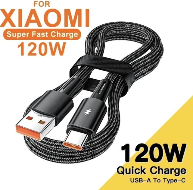 Кабель швидкої зарядки для Xiaomi 120W 90W 67W 33W Mi Turbo Charge USB Type-C 6A 1м, в обплетінні, Чорний