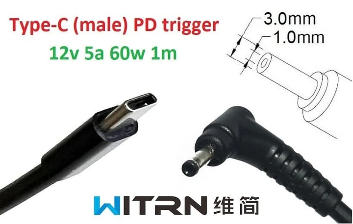 Перехідник на 12v (max 5a, 60w) 3.0x1.0(0.9/1.1)mm 1m з USB Type-C (male) Power Delivery PD (WITRN) тригер (A class) 1 день