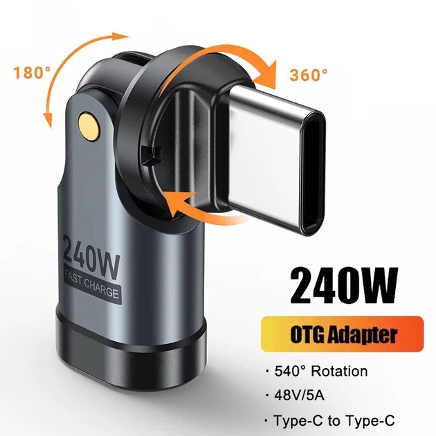Перехідник поворотний 540° USB Type-C M/F Fast Charge (PD3.1 240W 5A/48V) LED Metal Grey (48877)