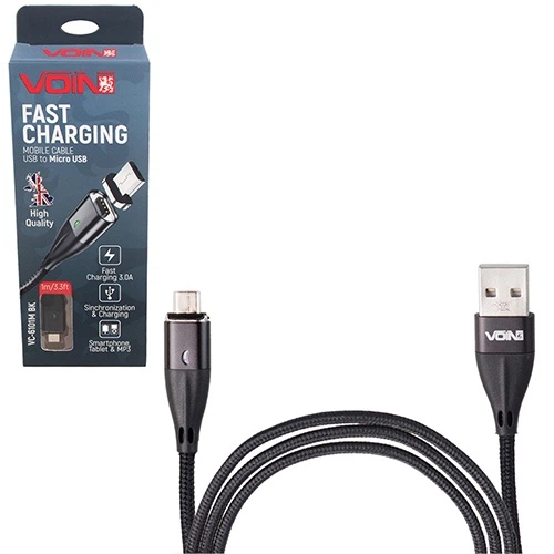 Кабель для заряджання магнітний Voin USB - Micro USB, 1м, 3.0А чорний (швидке. заряд, перед. дан