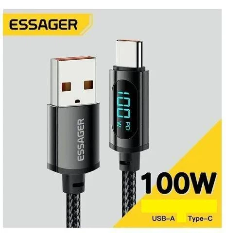 Кабель USB A до Type C Essager 100 Вт 6 А з дисплеєм для швидкої зарядки чорний