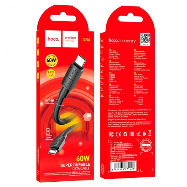 Кабель HOCO X84 Solid Type-C to Type-C 1м charging, струм до 3A для смартфонів 60W Чорний