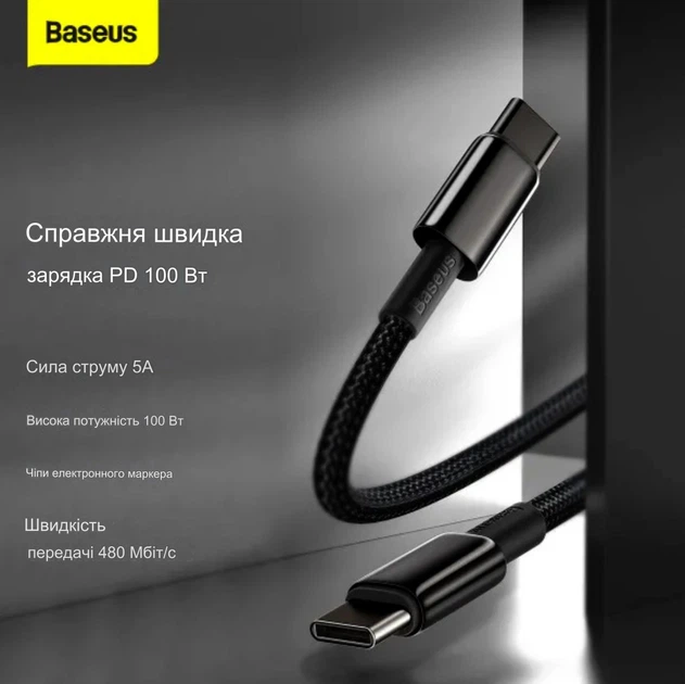 Кабель Baseus Tungsten Gold Type-C to Type-C 100W 1m 20V 5A для швидкої зарядки