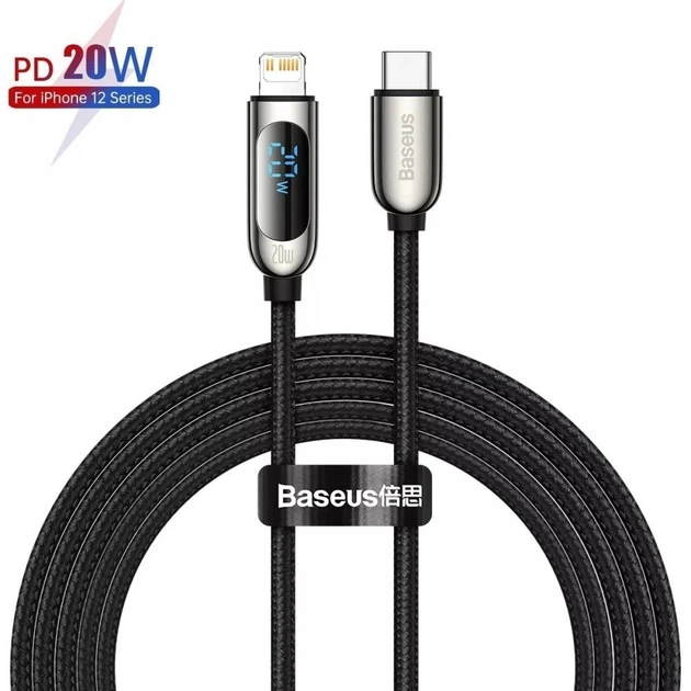 Кабель Baseus Type-C/Lightning LED Display Quick Charge для iPad/Android/ПК/MacBook 2m, 20W для iPhone 11/12/13 black