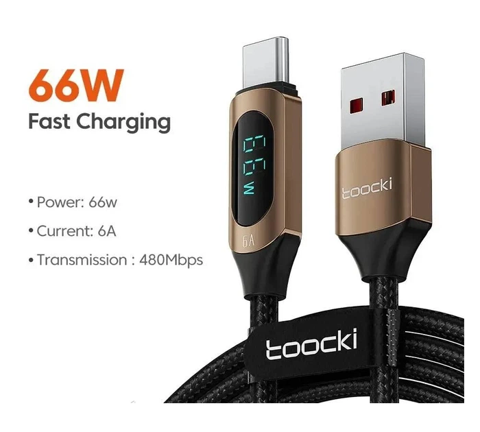 Кабель Toocki Power Display USB-A to Type-C 66W, 6A (2.0м) Brown з екраном потужності