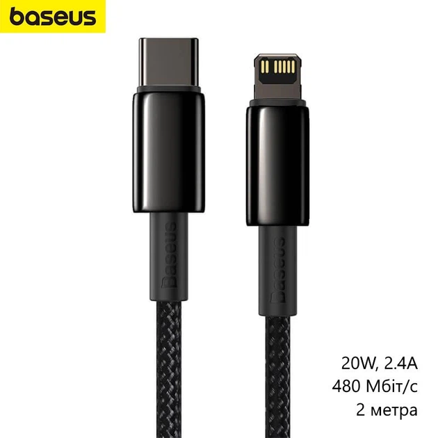 Кабель Baseus Type-C to Lightning (для пристроїв Apple, 20W, 2.4А, передача даних до 480 Мбіт/с, довжина 2 метри) - Чорний