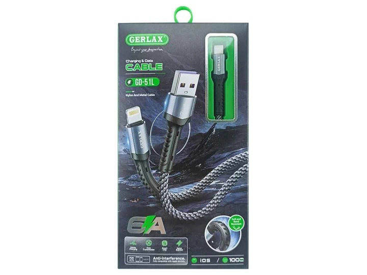 Кабель Gerlax Lightning iPhone GD-51L 6А тканинний сірий 1м