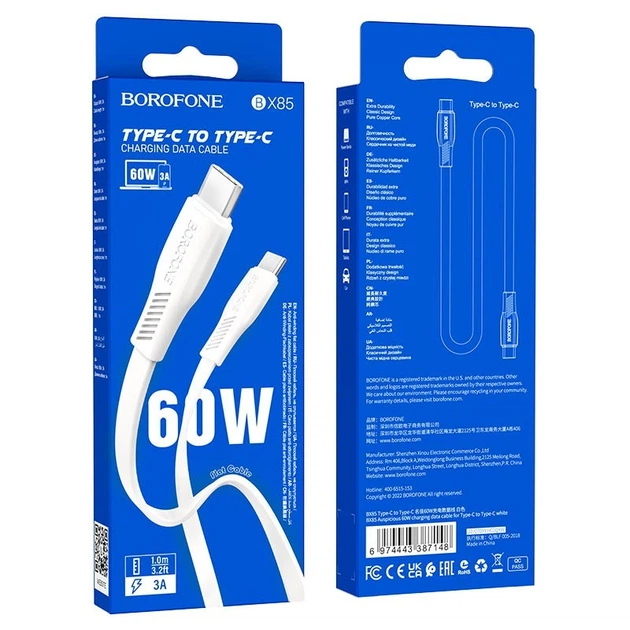 Кабель заряджання BOROFONE BX85 Type-C to Type-C (60W) (3А) швидка зарядка для телефону/смартфону Білий