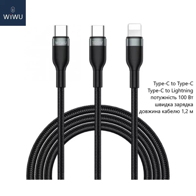 Кабель Wiwu WI C029 (Type-C to Type-C, Type-C to Lightning, потужність 100 Вт, швидка зарядка, довжина кабелю 1,2 м) - Чорни