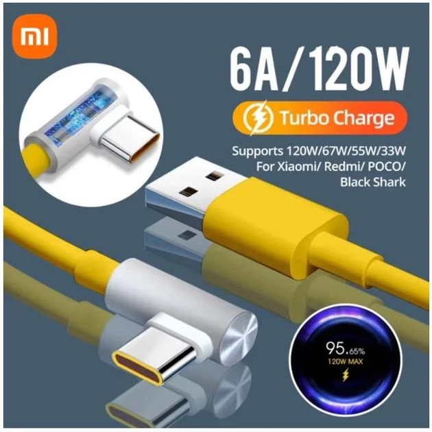 Кабель Xiaomi USB Type-C 6A турбо ( 33W 67W 90W 120W ) Жовтий кутовий 100 см. для швидкої зарядки смартфона, планшета Сяомі,