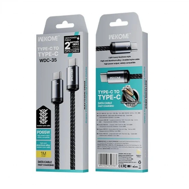 USB кабель Wekome WDC-35 Type-C to Type-C PD65W (Data cable 480Mbps/Super Fast Charging, Нейлонова плетена оболочка, длина-1