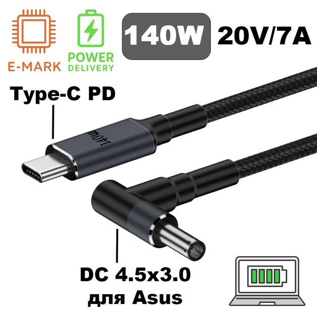 Кабель-перехідник PD 140W Type-C на DC 4.5x3.0x0.6 на 20V вольт 1.8 м для заряджання ноутбука Asus з тригером (1.8 метри) Po