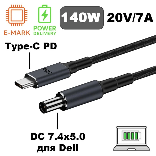 Кабель-перехідник PD 140W Type-C на DC 7.4x5.0x0.6 на 20V вольт 1.8 м для заряджання ноутбука Dell з тригером (1.8 метри) Po