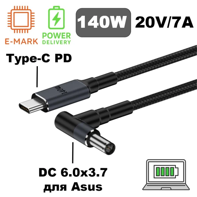 Кабель-перехідник PD 140W Type-C на DC 6.0x3.7x0.6 на 20V вольт 1.8 м для заряджання ноутбука Asus з тригером (1.8 метри) Po
