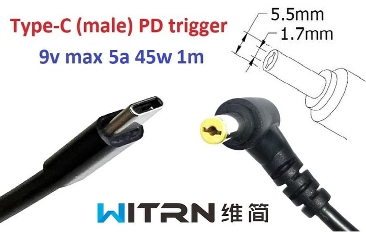 Перехідник на 9v (max 5a, 45w) 5.5x1.7mm 1m з USB Type-C (male) Power Delivery PD (WITRN) тригер (A class) 1 день гар.