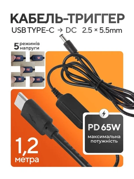 Кабель перехідник з USB Type C на DC тригер PD 65W для зарядки та живлення ноутбуків роутерів від зарядки або павербанка 5V