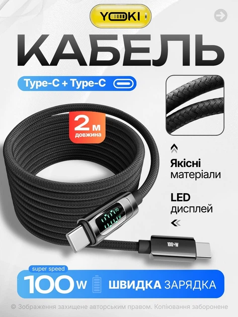 Кабель для зарядки YOKI DISPLAY YK-DI88 Type-C на Type-C 100W 2 м універсальний смарт інтернет шнур для швидкого заряджання