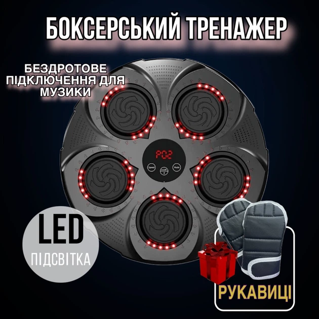 Боксерський тренажер з підсвічуванням, музикою, Bluetooth та дисплеєм настінна панель-мішень для боксу + рукавички (EL9552)