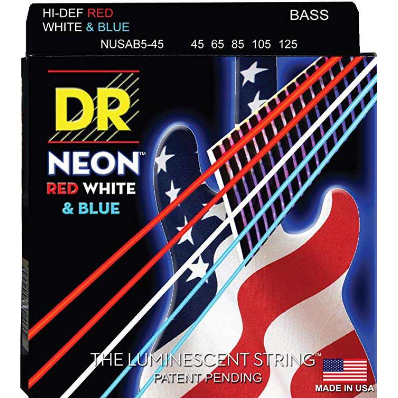 Струни для бас-гітари DR NUSAB5-45 Hi-Def Neon Red White & Blue K3 Coated Medium 5 Strings 45/125
