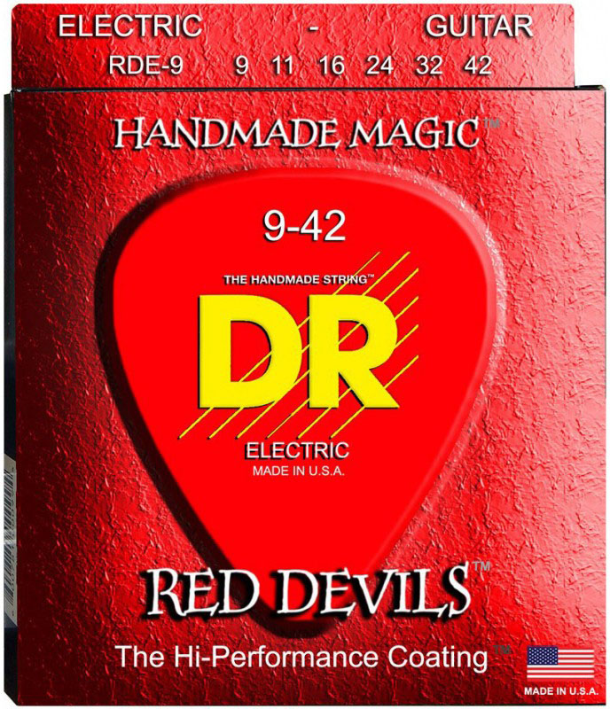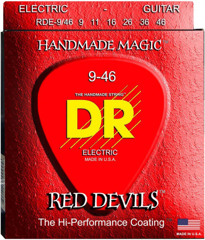 Струни для електрогітари, серія Extra Life, Red Devils. Натяг medium. Навивка кругла, покрита захисним хімічним складом. Серцевина струни сталь шестигранна. Колір покриття червоний. У цих струнах DR поєднується старомодне майстерність ручної роботи з самими новітніми технологіями. Струни покриті найтоншим (товщина всього 0,0003 мм) хімічним напиленням, що захищає їх від поту, бруду, вологи та