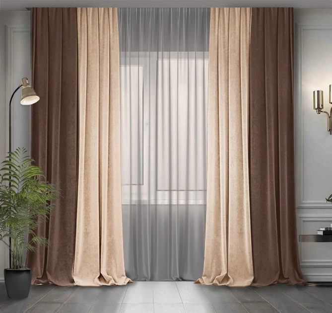 Комплект двоколірних штор Декор-Ін Мікровелюр 300x260 2 шт Бежеві з Коричневим (ROZ6400065401)