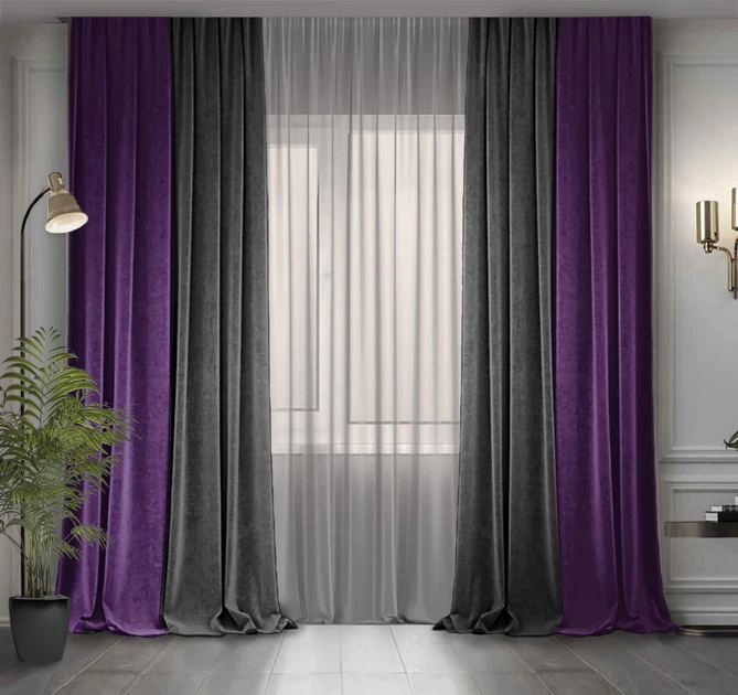 Комплект двоколірних штор Декор-Ін Мікровелюр 300x290 2 шт Темно-сірі з Темно-фіолетовим (ROZ6400067308)