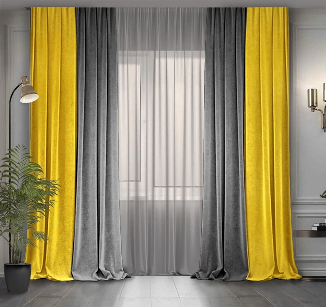 Комплект двоколірних штор Декор-Ін Мікровелюр 300x275 2 шт Темно-сірі з Гірчично-жовтим (ROZ6400067391)