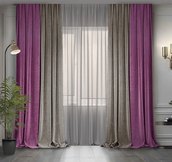 Комплект двоколірних штор Декор-Ін Мікровелюр 300x255 2 шт Сіро-бежевий з Рожево-бузковим (ROZ6400065847)
