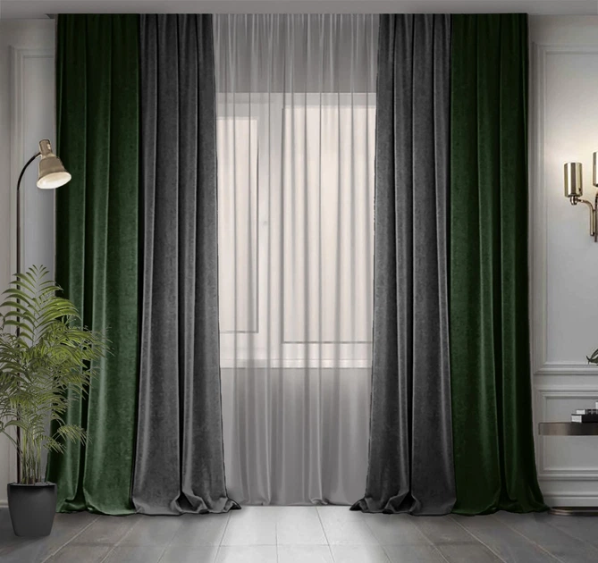 Комплект двоколірних штор Декор-Ін Мікровелюр 300x275 2 шт Темно-сірі з Темно-зеленим (ROZ6400067251)
