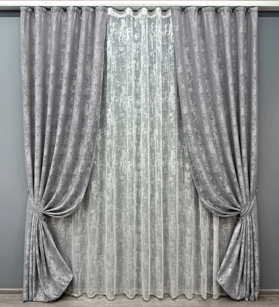 Комплект штор VR-Textil Жакард Мармур 200х270 2шт і Тюль 600х270 1668ш-1400т Сірий з білим 71-001/7