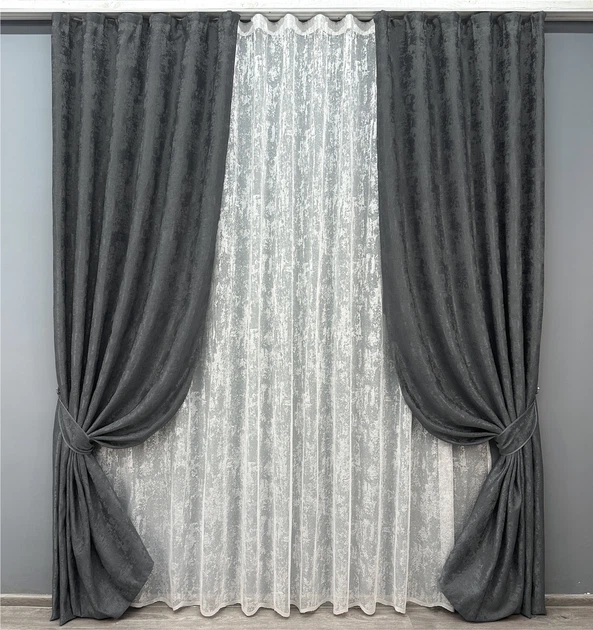 Комплект штор VR-Textil Жакард Мармур 200х270 2шт і Тюль 600х270 1123ш-1400т Графітовий з білим 71-003/7