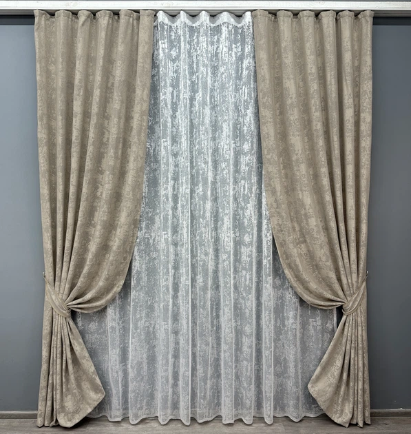 Комплект штор VR-Textil Жакард Мармур 200х270 2шт і Тюль 600х270 1208ш-1400т Бежево-сірий з білим 71-006/7