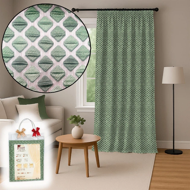 Штора жакардова Aurum 310250 см зелена з вишивкою у дрібну клітинку — для спальні та вітальні