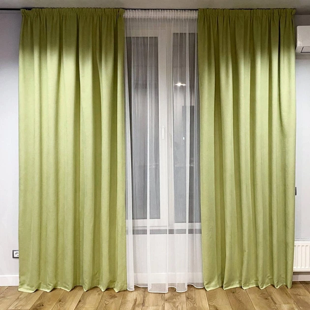 Комплект штори 2 шт 300х250 см мікровелюр Світло-зелений, тюль бамбук 500 см Тепло-білий