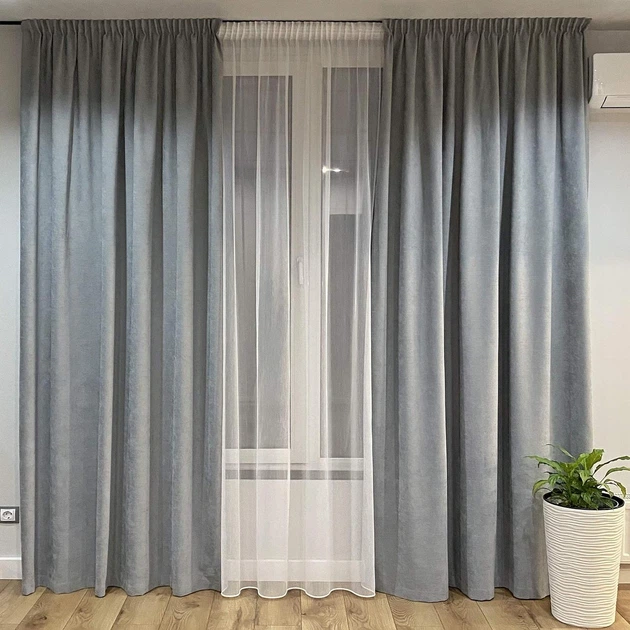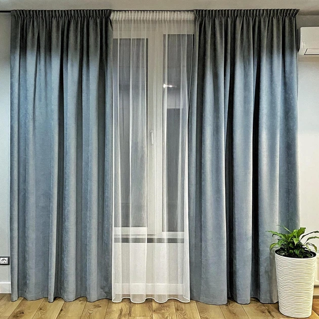 Комплект штори 2 шт 220х250 см мікровелюр Сіро-синій, тюль бамбук 700 см Тепло-білий
