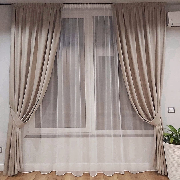 Комплект штори 2 шт. з підхватами 250х240 см мікровелюр Беж-капучино, тюль бамбук 600 см Тепло-білий