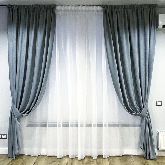 Комплект штори на тасьмі 2 шт з підхватами 280х250 см мікровелюр Сіро-синій, вуаль 700 см Білий