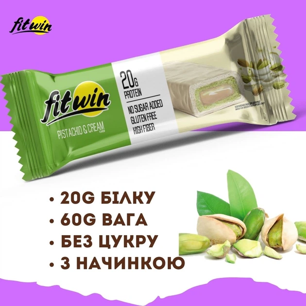 Батончик протеїновий PISTACHIO CREAM FitWin No Sugar Added Gluten Free вага 60 грам без цукру з начинкою Фісташка та Крем
