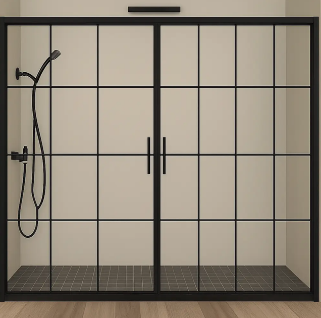 Душові двері Aquanil TREND 155190 см, прямокутна, скло з декором клітка, чорний профіль